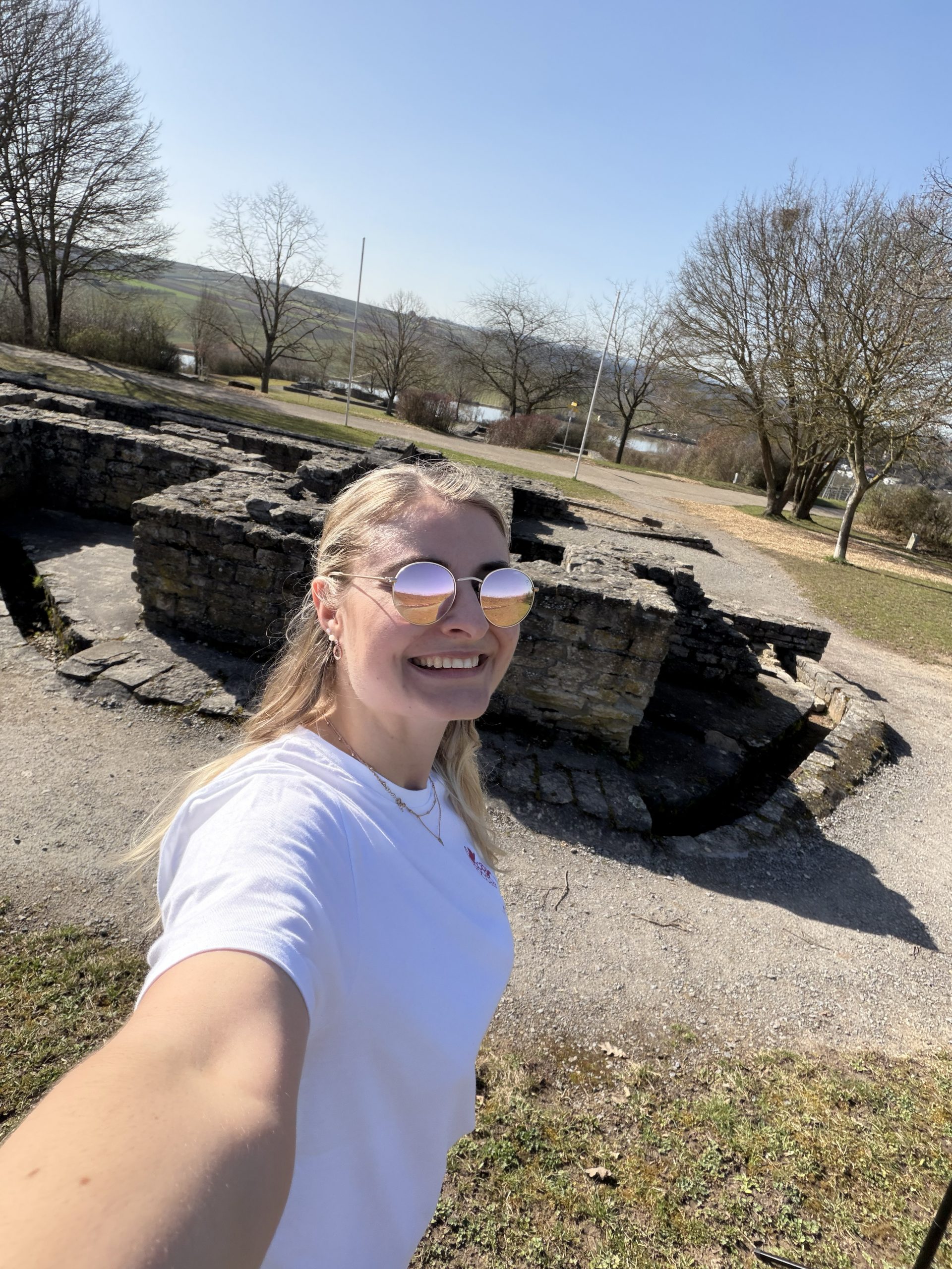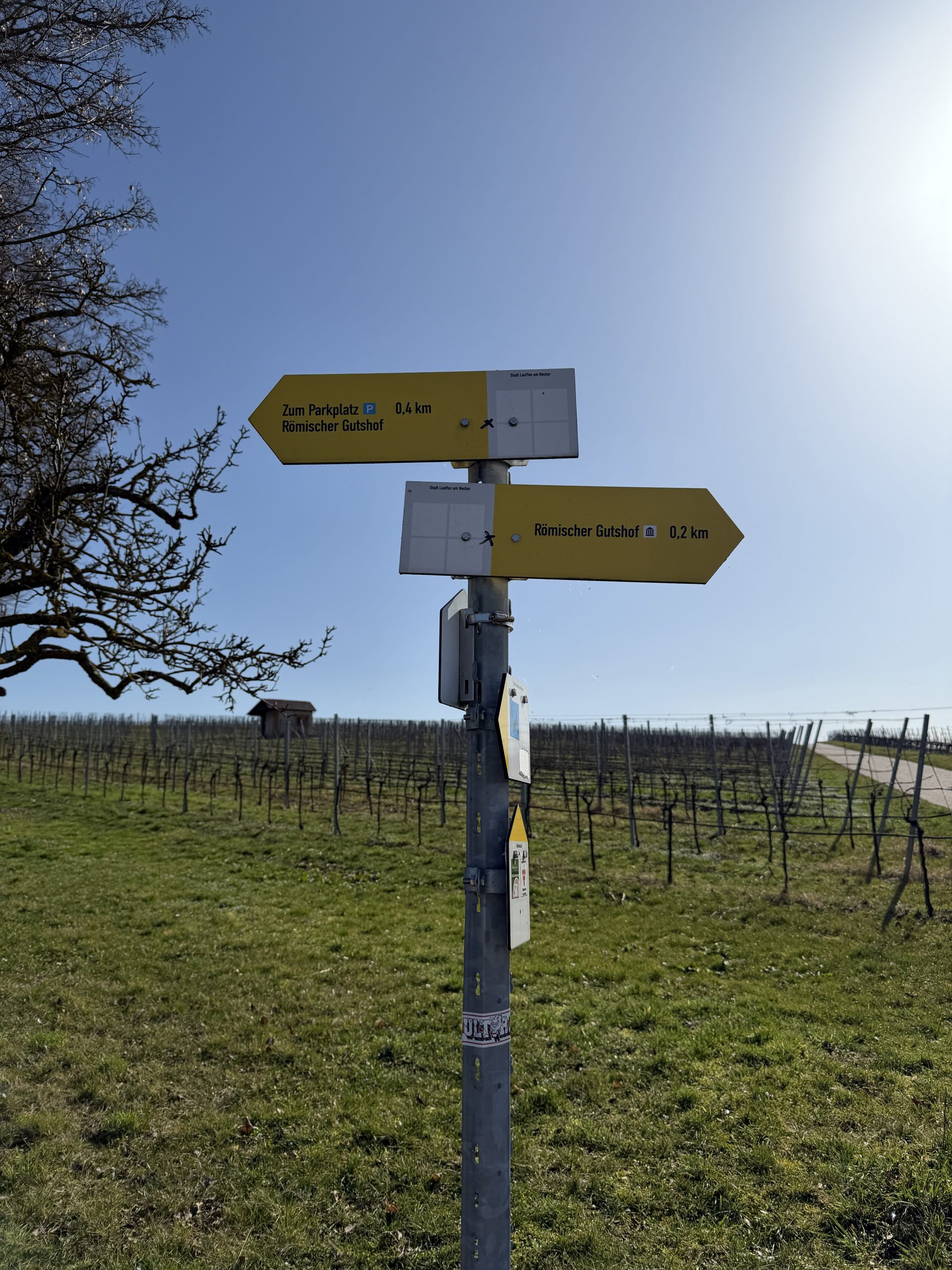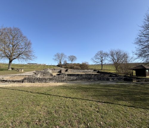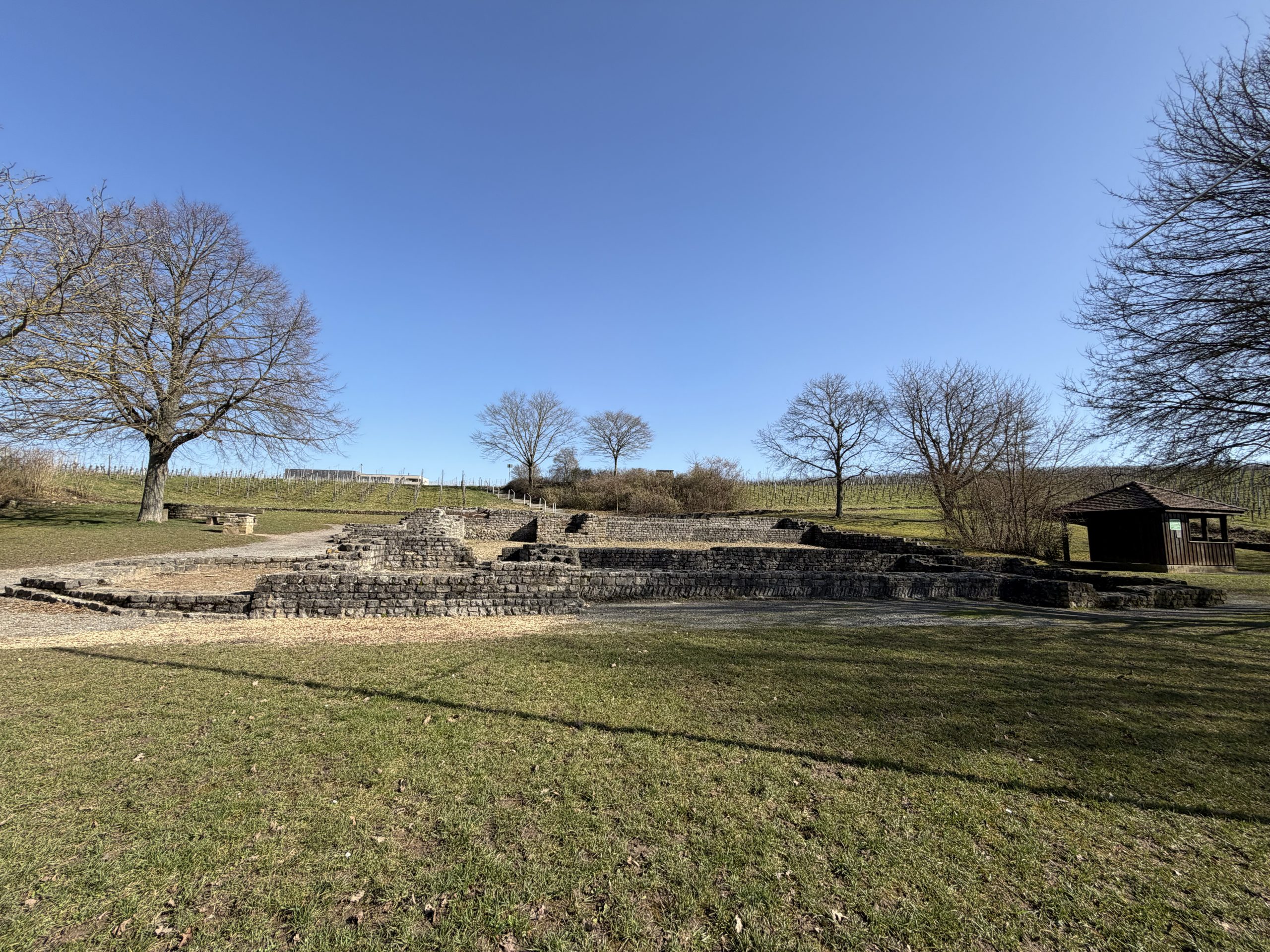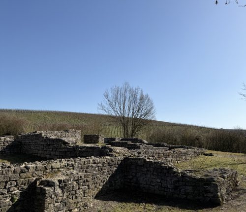 Vom Parkplatz führt ein Planweg direkt durch die Weinreben. Bereits nach wenigen Minuten öffnet sich der Blick auf die Überreste eines römischen Gutshofes, ein stiller Ort, der von der langen Weinbaugeschichte dieser Region erzählt.