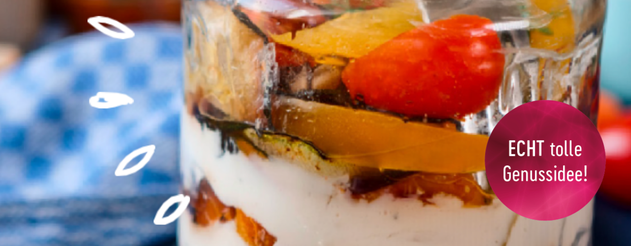 • In ein Schraubglas oder ein Dessertglas abwechselnd Gemüse und Ziegenkäsecreme schichten.