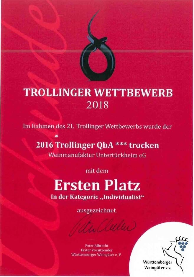 Man sieht die Sieger-Urkunde der Weinmanufaktur Untertürkheim beim Trollinger Wettbewerb 2018 in der Kategorie "Individualist", gewonnen hat der 2016er Trollinger Drei Stern trocken.